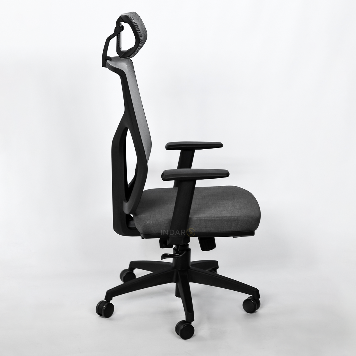 Cabezal tapizado en red, pivotante y regulable en altura.
