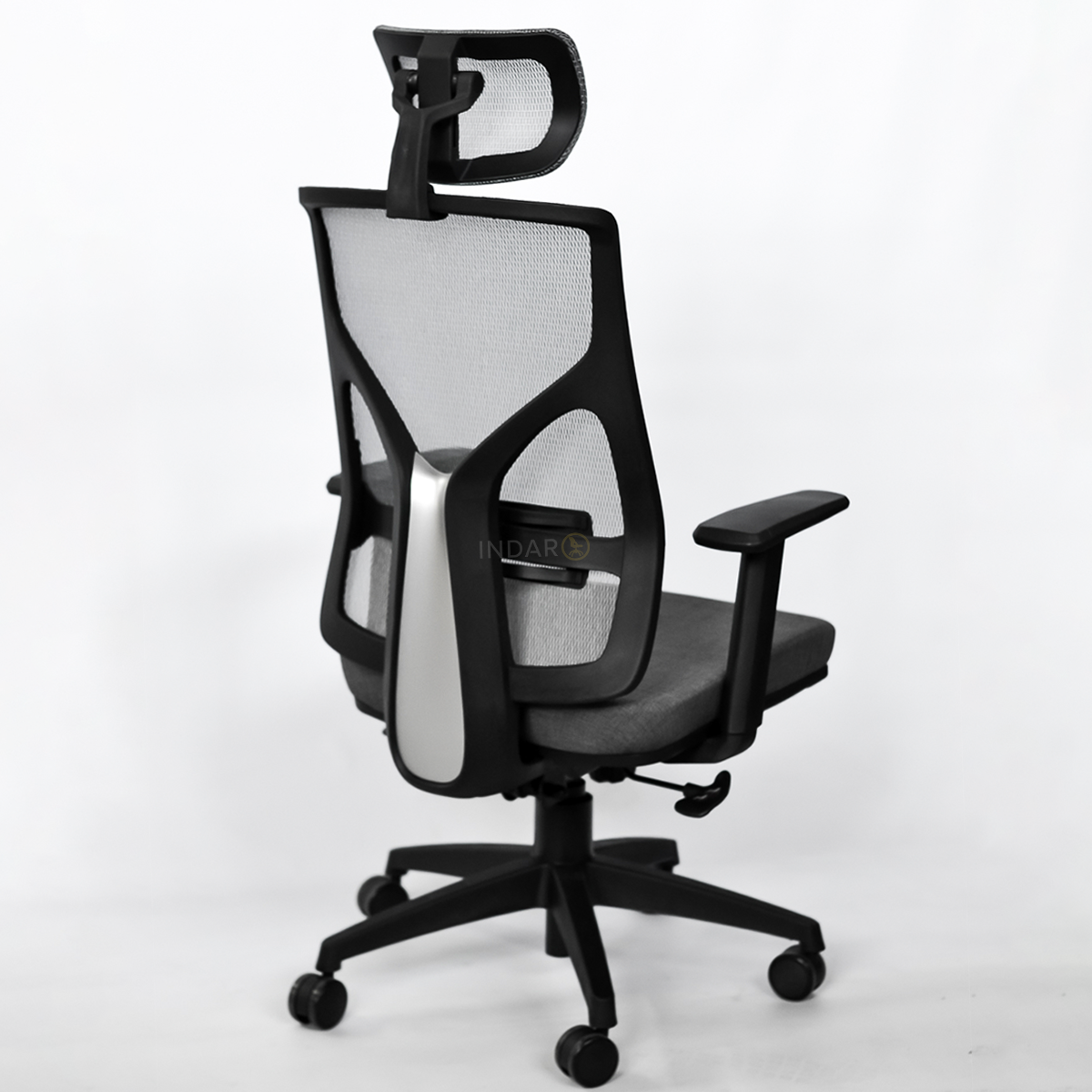 Respaldo ergonómico de tela de red gris oscuro.